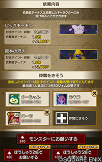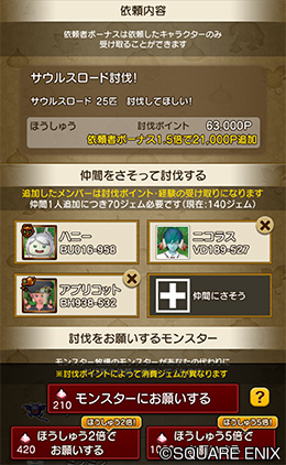 ・「仲間をさそって討伐する」「モンスターにお願いする」で消費するジェムの量は、誘ったメンバー数や討伐依頼を達成することで得られる討伐ポイントに応じて変化します。