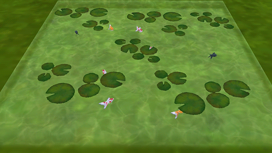 蓮が浮かぶ透き通る水辺で、金魚が泳ぐデザイン!