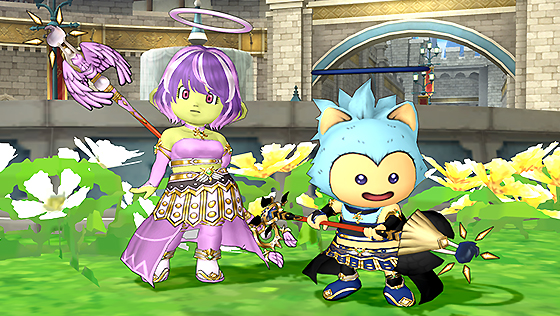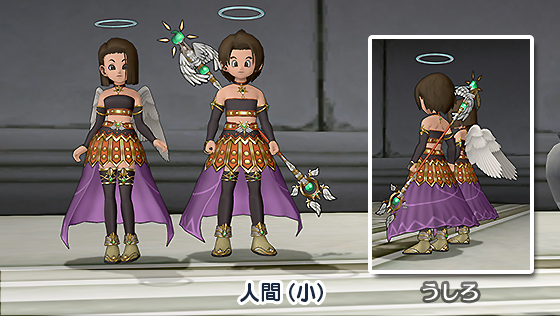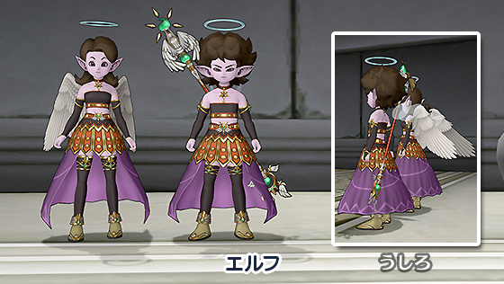 天使の輪を模したアタマ装備に、ゴールドのラインが美しいころもの上下。