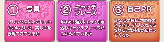 『自画撮り』の写真技術を中心に、ドレスアップ、キャッチフレーズ、自己PRを加味し、プリンセスにふさわしいキャラクターを最大100キャラクター選出します。 第2次審査(決勝戦) : 冒険者の投票