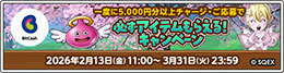 | 2026/2/13 |  ビットキャッシュを5,000円以上購入して条件を満たすと、さまざまな特典アイテムがもらえるキャンペーンを開催しました。 |