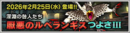 | 2026/2/25 |  「深淵の咎人たち」の「4人パーティバトル」に、究極状態となった「厭悪のルベランギス」つよさⅢ が登場しました。 |