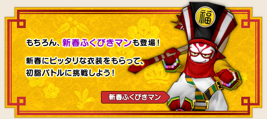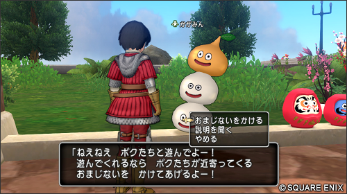 「かがみん」におまじないをかけてもらい、効果時間中にフィールドでモンスターと戦闘を開始すると、おともとして「スライムかがみもち」「メタルかがみもち」が出現! 冒険者全員で「スライムかがみもち」「メタルかがみもち」をたくさん倒そう!!
