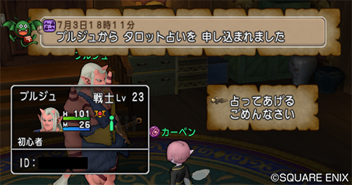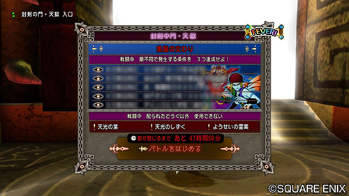 | バージョン7追加パッケージ「未来への扉とまどろみの少女」の導入。 バージョン2.3メインストーリー「天翔ける希望の双翼のおはなし」のクリア。 「僧侶」と「レンジャー」の職業レベルが100以上になっている。 | |