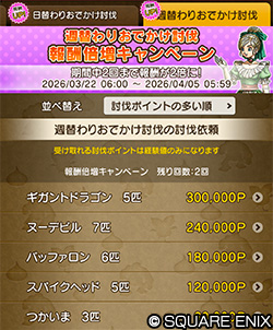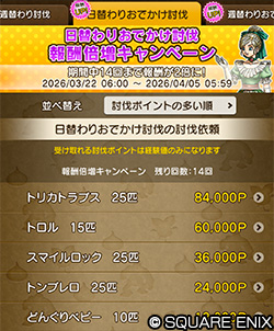 キャンペーン期間中は、討伐隊の依頼の日替わりおでかけ討伐の報酬「討伐ポイント」が毎日(期間中最大14回)倍増!