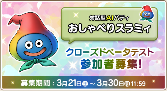 本クローズドベータテストは、テスターとして選ばれた冒険者のみなさまに、現在開発中の「おしゃべりスラミィ」をご利用いただき、新しい体験の可能性を探るものです。