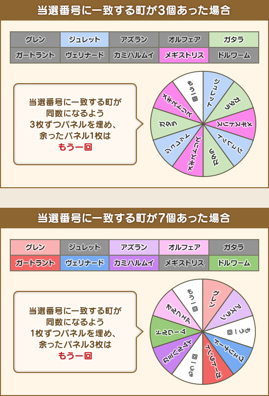 | 条件1 | 10枚のパネルを、該当する町の確率が等倍になるように埋める |