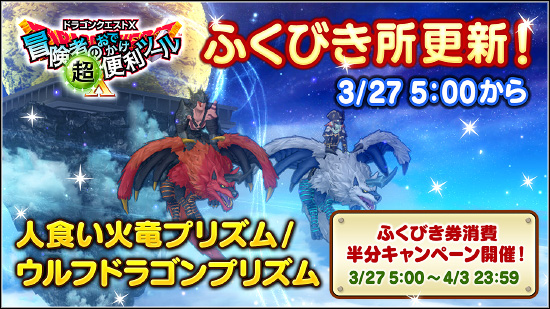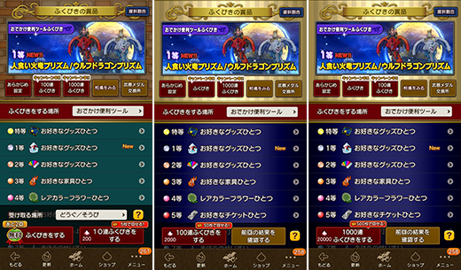 ※ 「人食い火竜プリズム」「ウルフドラゴンプリズム」は、今回を含めふくびき更新3回分の期間1等に並び、その後は2等には入らず、賞品ラインナップから外れます。ラインナップから外れてからふくびき更新3回分の期間が過ぎると、ゆめのかけら交換所に追加します。