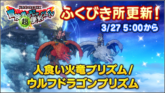 ※ 「人食い火竜プリズム」「ウルフドラゴンプリズム」は、今回を含めふくびき更新3回分の期間1等に並び、その後は2等には入らず、賞品ラインナップから外れます。ラインナップから外れてからふくびき更新3回分の期間が過ぎると、ゆめのかけら交換所に追加します。