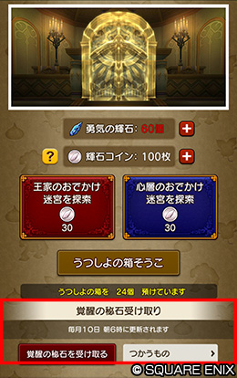 - ※「覚醒の秘石」の取得権利は、ゲーム内と共通になります。『ドラゴンクエストX オンライン』ゲーム内か「王家のおでかけ迷宮」機能で「覚醒の秘石」を入手すると、もう一方で入手することはできなくなります。