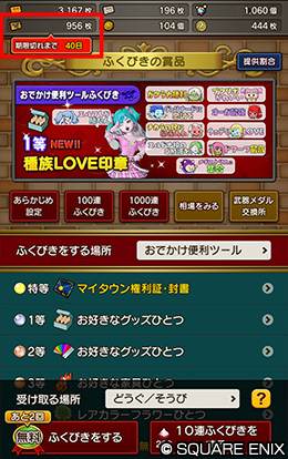 ふくびき所の画面で、「おでかけふくびき券」の個数が表示されている箇所をタップすると、使用可能期間が確認できます。