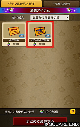 「ゆめのかけら交換所」にて、「消費アイテム」の項目に「おでかけふくびき券」を追加します。