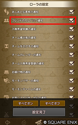 「カムバック通知」のON/OFF設定は、「ドラキー通知の設定 」に追加される「フレンドのカムバック通知」で行えます。