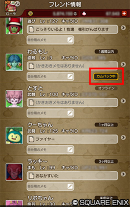 - ※カムバックの期間は、『ドラゴンクエストX オンライン』にログインしてから90日間となります。