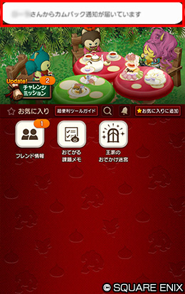「カムバック通知」は、任意のフレンドの『冒険者のおでかけ超便利ツール』に対し、カムバックしたことを通知できる機能です。