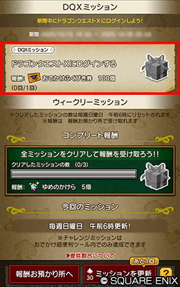 - ※ミッション期間中に『ドラゴンクエストX オンライン』にログインした後、「チャレンジミッション」画面に移動することで報酬を獲得できます。