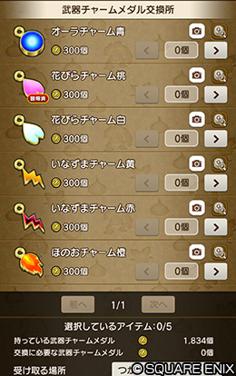 「アイテム交換所」の「武器チャームメダル交換所」で「武器チャームメダル」300個と各「武器チャーム」を交換できます。