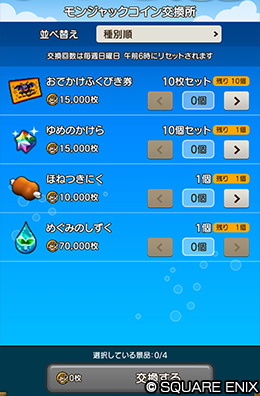「モンジャックコイン」は「モンジャックコイン交換所」にて「おでかけふくびき券」「ゆめのかけら」などのアイテムと交換できます。