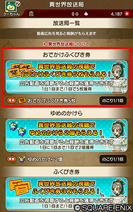 「異世界放送局」にて、新たに「おでかけふくびき券」が獲得できる動画広告を追加します。